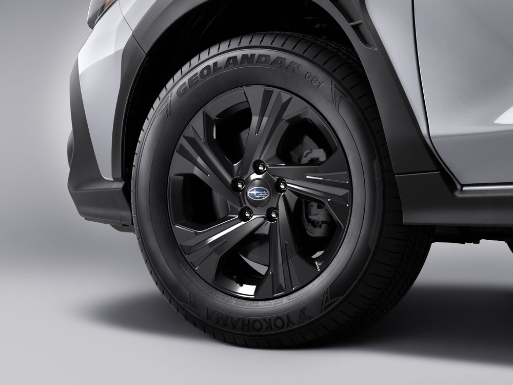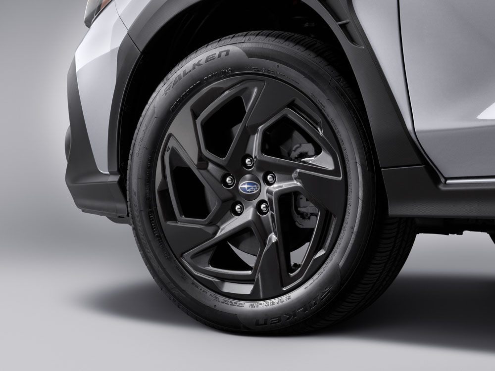 The 2026 Subaru Crosstrek features a bold exterior design with a powerful presence. It features a sculpted body, frameless hexagonal grille, standard Steering Responsive LED headlights and boldly shaped black wheel arch cladding with functional air outlets front and back, all enclosed in a compact and capable package. The Onyx trim level showcases a sharp yellow and gun-metal paint accent scheme for added visual impact.