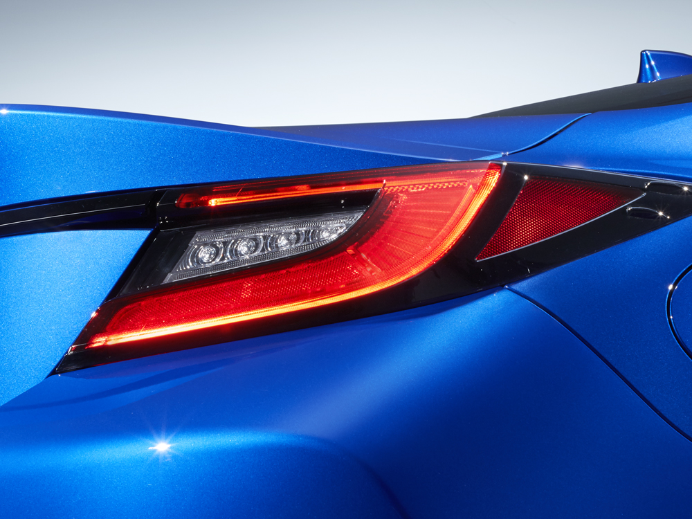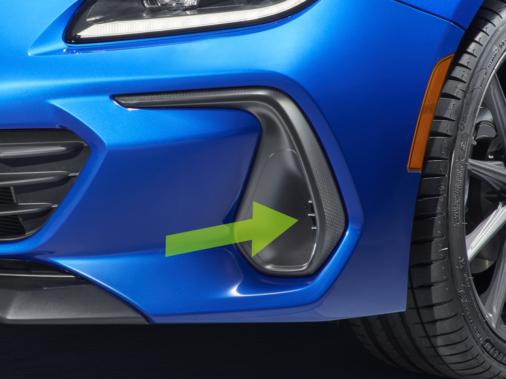 The LED headlight assembly features a sharp, stylish design with a sculpted, assertive look. A molded outer cover and black inner surround add to its sporty feel. The BRZ word mark is stamped on the side extensions, with the tS trim showcasing it in red for extra impact. The Sport-tech, tS and 雷 Kaminari Edition trims come with LED steering-responsive headlights, providing a brighter, whiter beam that adjusts to the direction of turns, enhancing visibility while cornering.