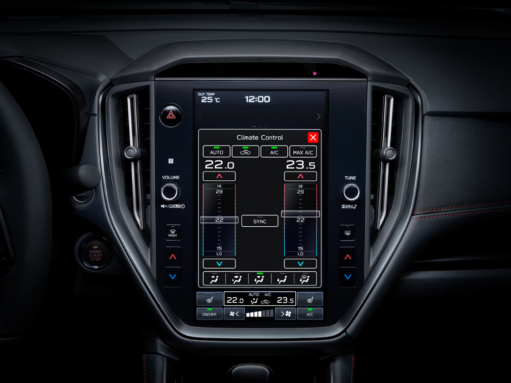 Disponible sur tous les modèles WRX Sport, ce système d’infodivertissement AM/FM/MP3/WMA intermédiaire comprend un écran tactile vertical de 11,6 pouces, la connectivité pour téléphones mobiles BluetoothMD avec activation vocale et lecture audio en continu, un port USB-A et un port USB-C à l’avant et à l'arrière, une entrée audio auxiliaire et des commandes intégrées au volant. Le système offre la fonctionnalité Apple CarPlayMD et Android AutoMC sans fil, vient avec six haut-parleurs et intègre la compatibilité SiriusXMMD‡.